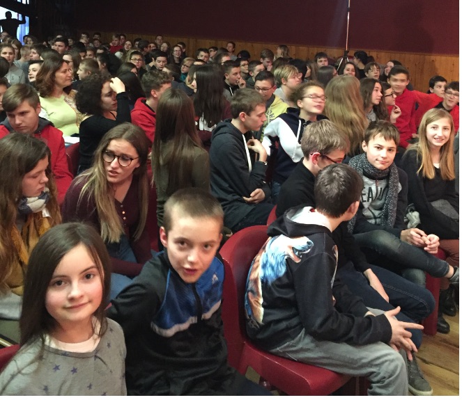 Jamais encore, je n’avais entendu en séance scolaire autant d’applaudissements. Très vite et humblement Valérie reprend la main et la parole pour entamer le débat. Il s’agit de parler du rôle des femmes durant la guerre, de leur condition à cette époque et de son évolution de nos jours. Une élève demande à Valérie : « Comment tu arrives à pleurer pour du vrai ». « Ce n’est pas moi qui pleure pour de vrai c’est mon personnage ». Et puis une autre question sur le respect envers les femmes, « les filles ont le droit de dire non et de voter » dit Isabelle l’autre artiste du spectacle. Et encore une question puis une autre et enfin la dernière.
